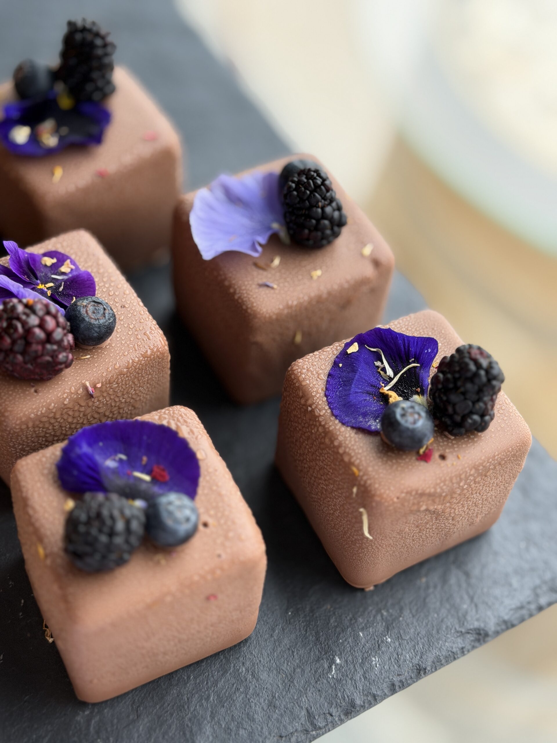 Čierna ríbezla v hlavnej úlohe – ako intenzívny kyselkavý vklad, našľahaný krémový mousse, bezlepkový brownie korpus a napokon chrumkavý kabátik z mliečnej čokolády.